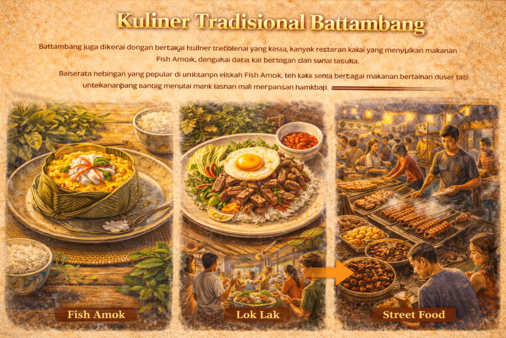 Battambang juga dikenal dengan berbagai kuliner tradisional yang lezat. Banyak restoran lokal yang menyajikan makanan khas Khmer dengan bahan-bahan segar dari daerah sekitar.